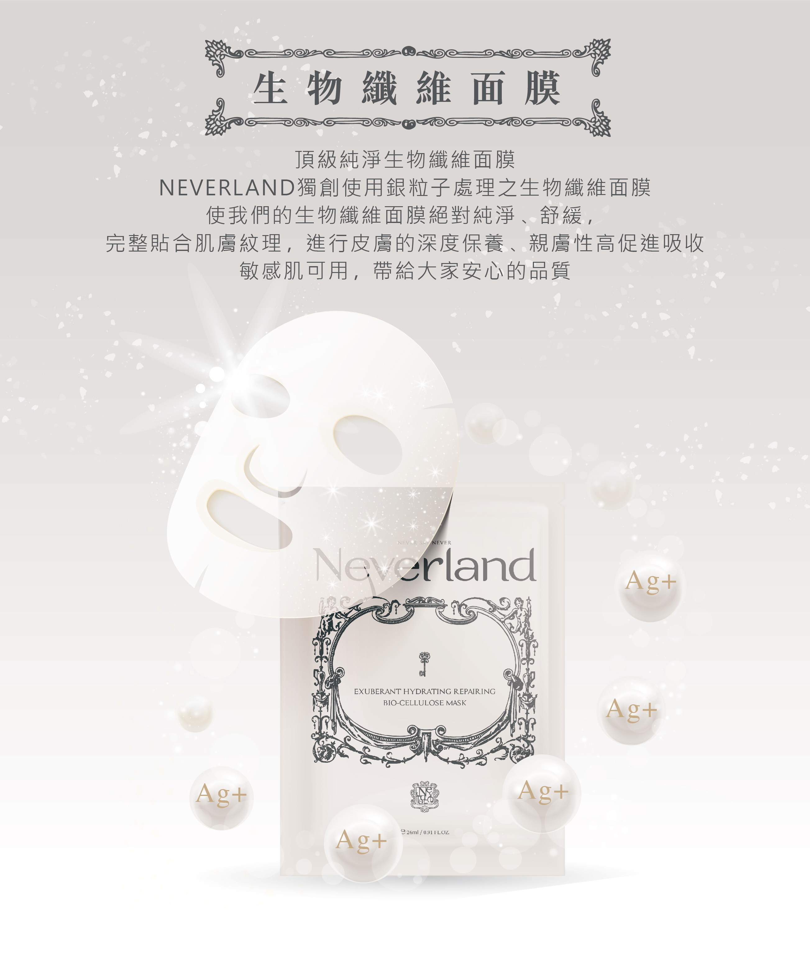 Neverland獨創使用銀粒子處理之生物纖維面膜,使我們的生物纖維面膜絕對純淨、舒緩,完整貼合肌膚紋理,進行皮膚的深度保養、親膚性高促進吸收。