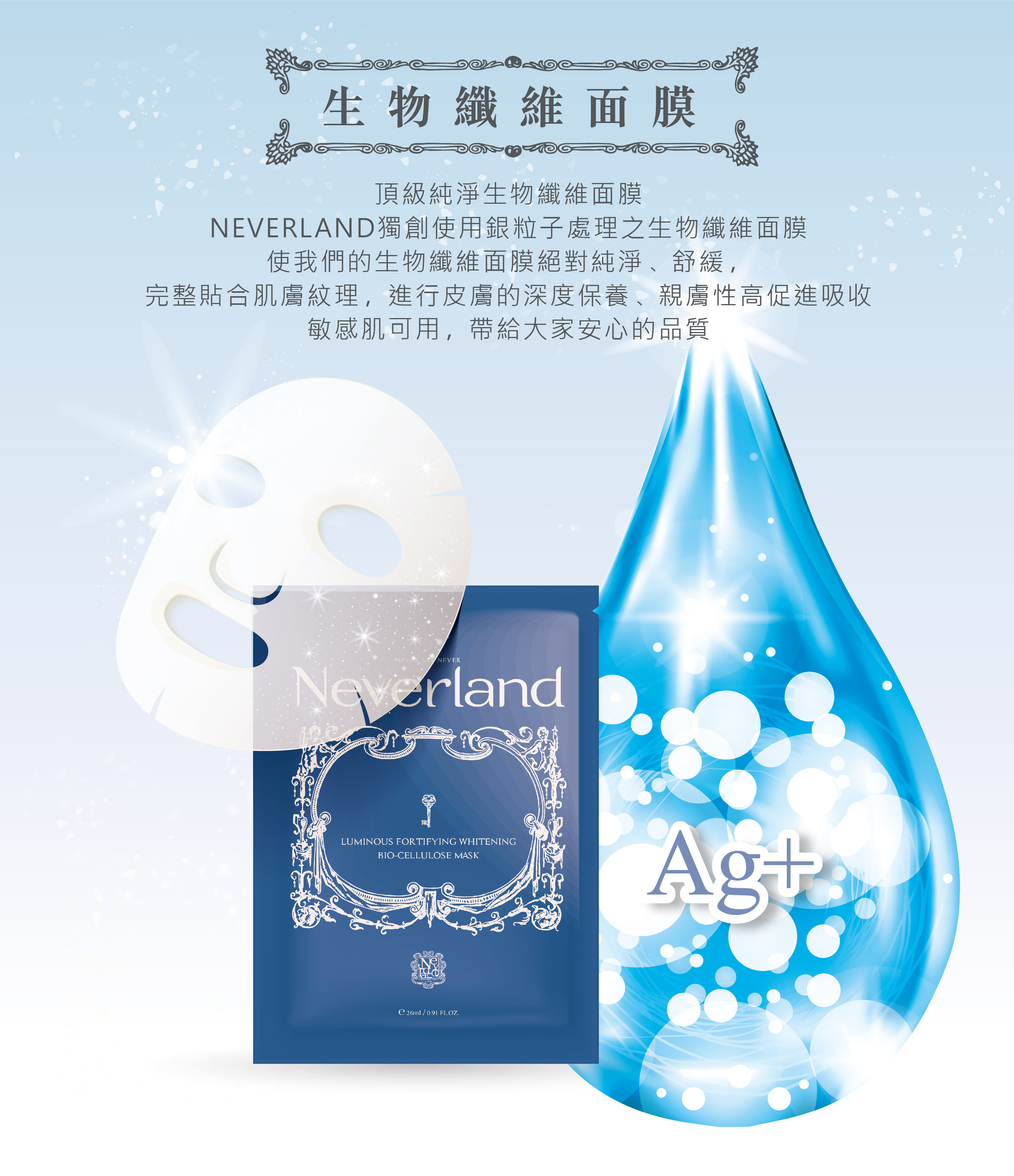 Neverland獨創使用銀粒子處理之生物纖維面膜,使我們的生物纖維面膜絕對純淨、舒緩,完整貼合肌膚紋理,進行皮膚的深度保養、親膚性高促進吸收。