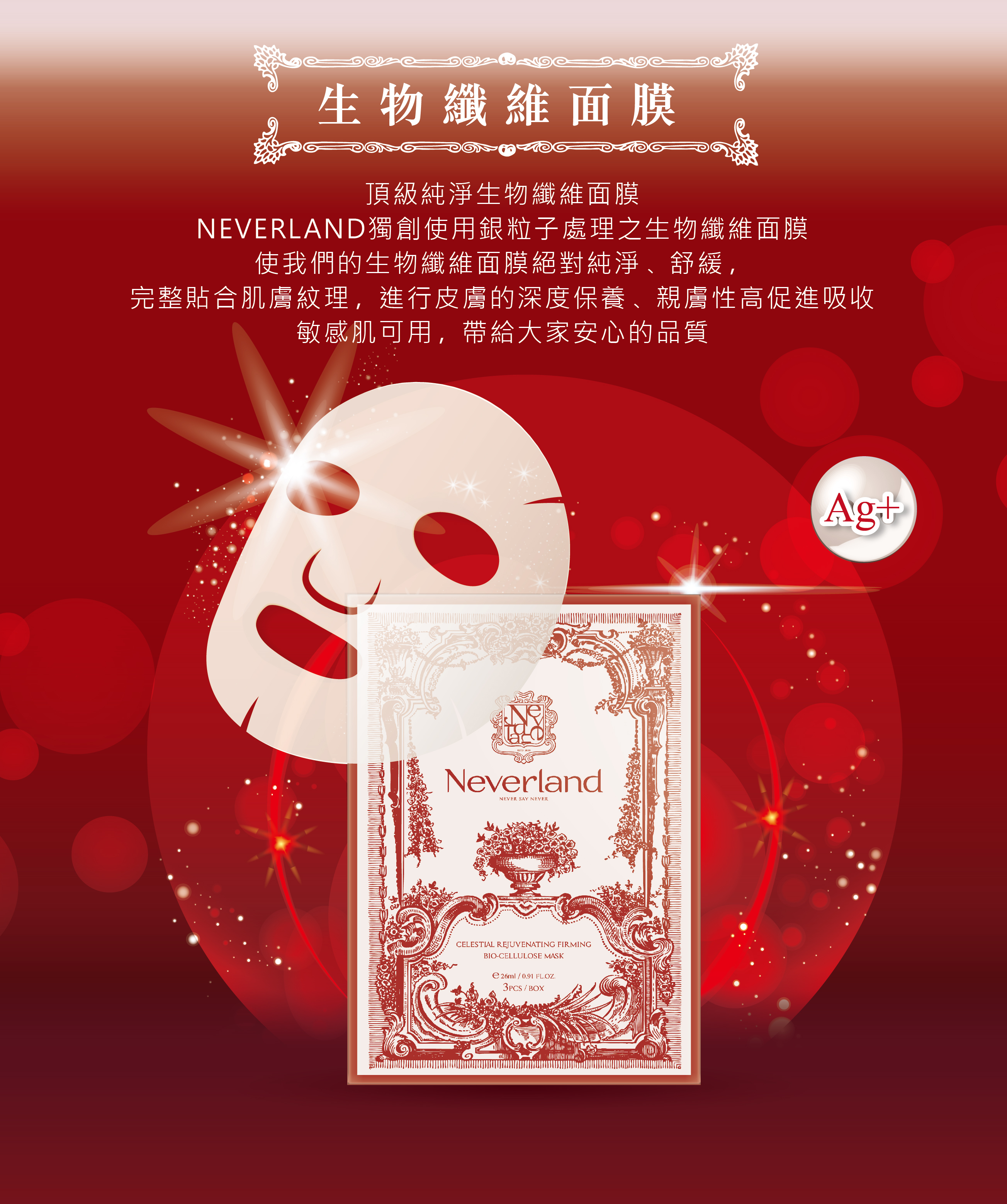 Neverland獨創使用銀粒子處理之生物纖維面膜,使我們的生物纖維面膜絕對純淨、舒緩,完整貼合肌膚紋理,進行皮膚的深度保養、親膚性高促進吸收。